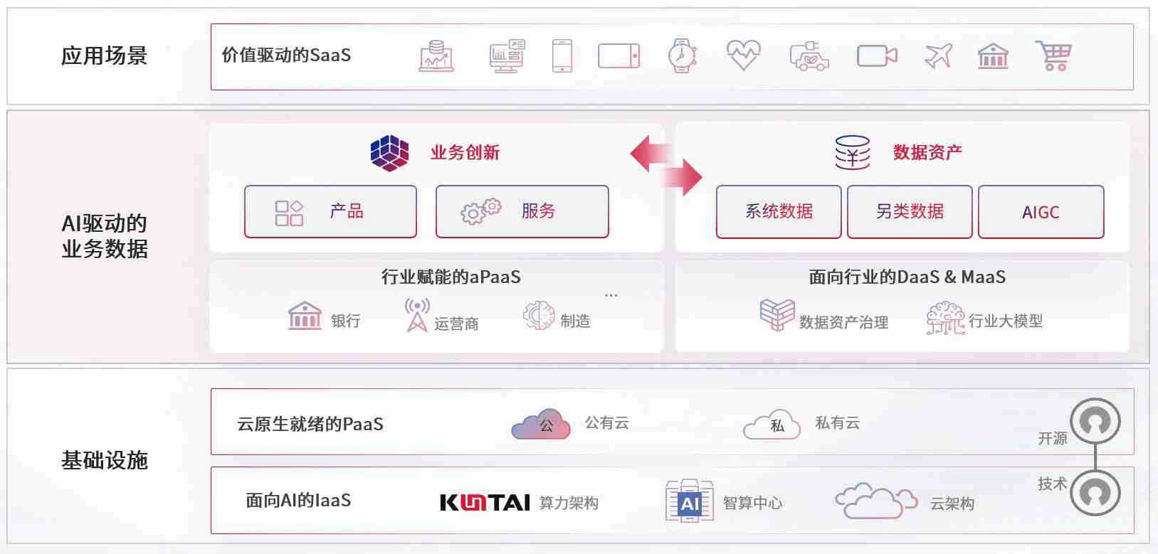 数字时代,,围绕企业数字化转型的关键要素,,,,2939威尼斯数码开创性的提出数云融合战略和技术体系框架,,着力在云原生、、、、数字原生、、、、AI原生和信创产业上架构产品和服务能力,,,,为处在不同数字化转型阶段的快消零售、、、、汽车、、、金融、、、、医疗、、、政企、、教育、、运营商等行业客户提供泛在的敏捷IT能力和融合的数据驱动能力,,,构建跨界融合创新的数字业务场景和新业务模式,,,助力企业级客户建立面向未来的核心能力和竞争优势,,,,全面推动社会的数字化、、、、智能化转型升级。。。。