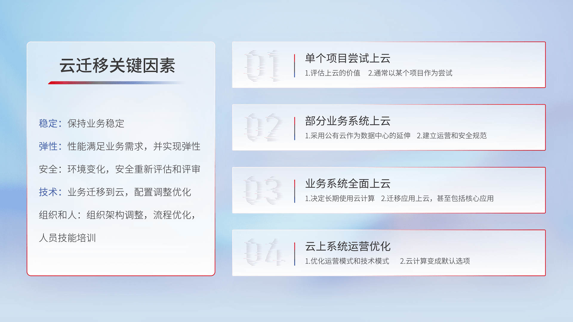 结合实际业务,,,,从规划设计、、、、云平台选型、、、、云原生改造、、、数据迁移、、、、集成交付,,,迁移全过程为客户识别最佳上云路径,,,,做好风险识别管理,,,,设计网络架构、、、、身份权限、、、安全审计合规、、、操作审计、、、、日志审计、、、、监控告警策略、、、多站点容灾设计等,,对云上基础设施进行整体规划,,,,提升IT治理水平,,以满足弹性、、、高可用、、、高性能的需求。。。