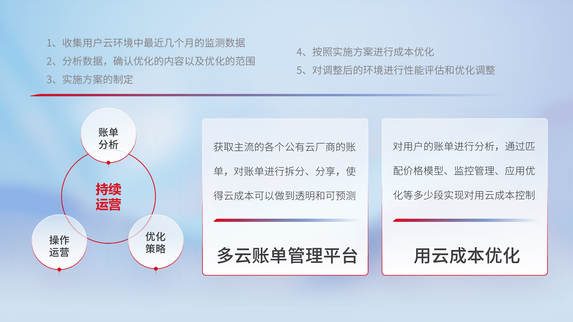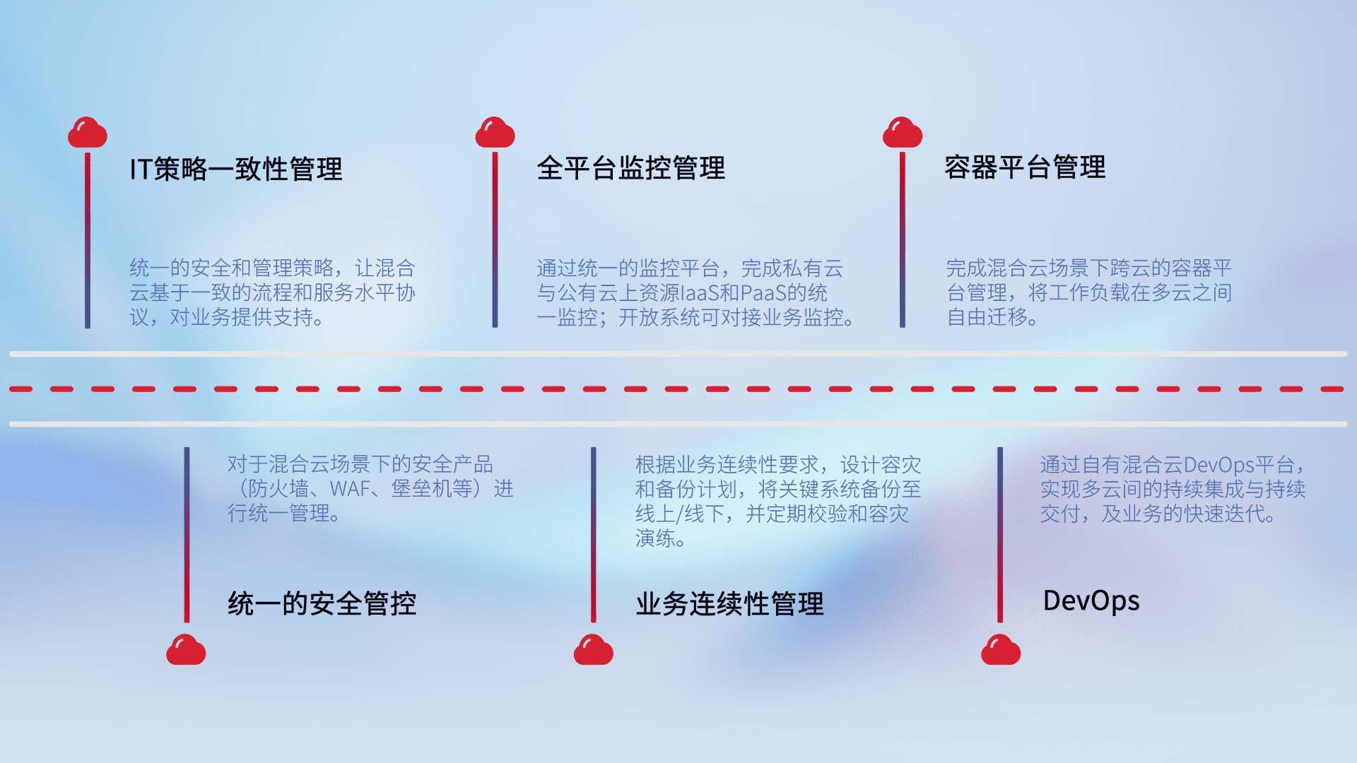通过多云纳管,,,,以统一的资源数据模型把客户的云资源进行抽象和封装,,,,进而实现对多云资源的统一操作,,,保障云资源管理的可靠性、、、稳定性与可用性。。。量身定制化运维内容,,,配置、、、、开发运维、、、补丁管理、、、、备份、、监控、、、认证和访问管理、、、、审计和日常巡检等,,,保障在用云过程中的可靠度,,,稳定度以及高可用率。。