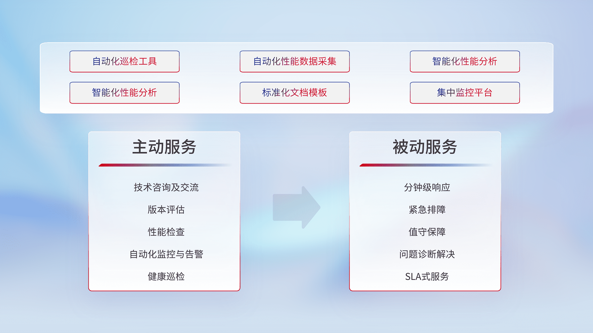 智能化工具和标准化文档,,,保障服务质量,,提供主动服务(包含技术咨询、、版本评估、、性能检查、、、、自动化监控与告警、、、、健康巡检)和被动服务包含(分钟级响应、、、紧急排障、、、、值守保障、、、、问题诊断解决、、、、SLA服务)。。